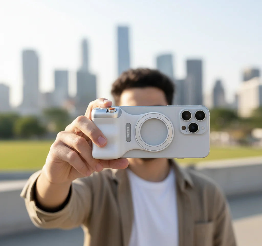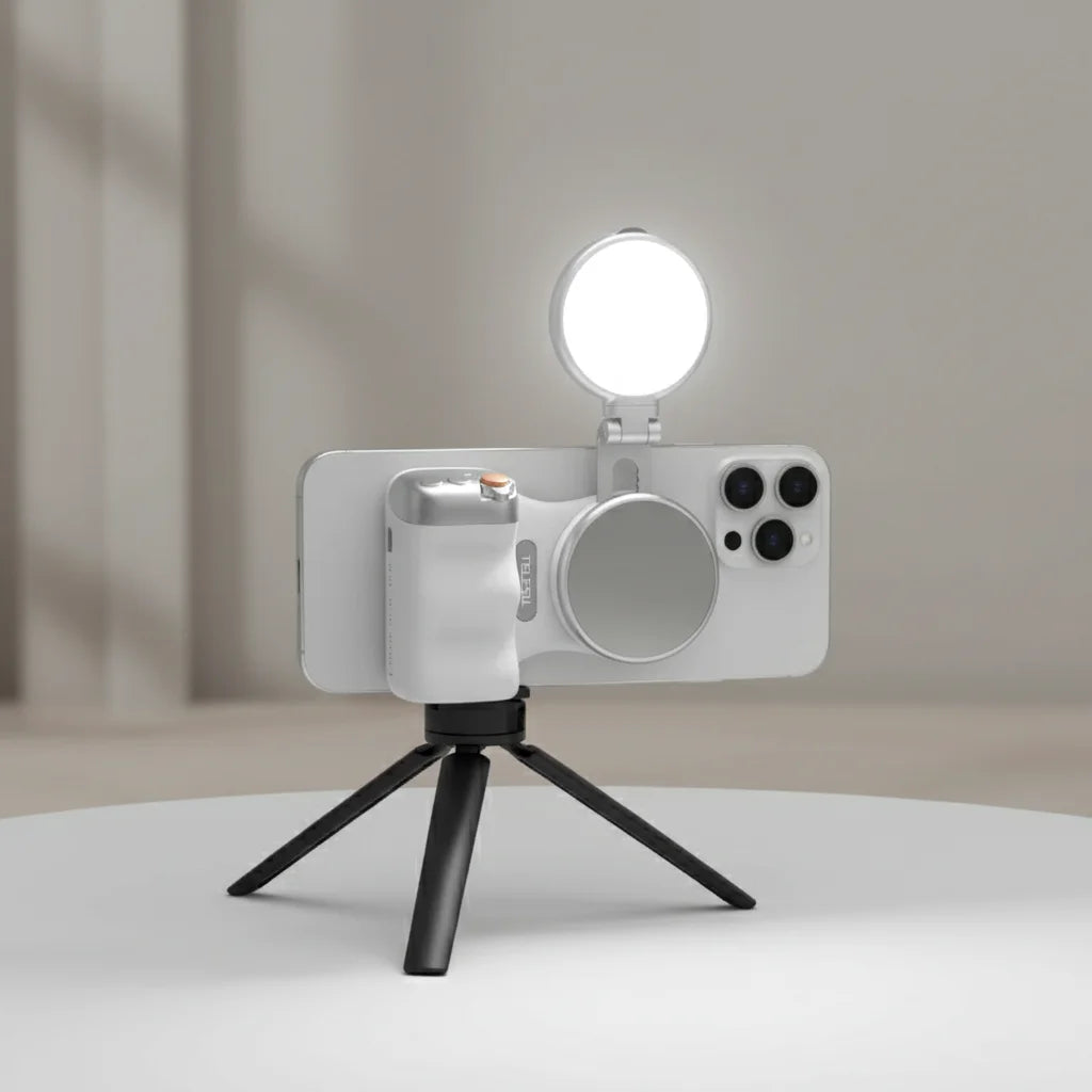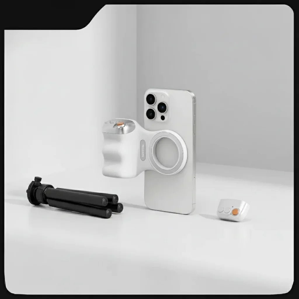 O suporte magnético que transforma seu celular em uma câmera profissional. Aesthetic, funcional e absurdamente fácil de usar!